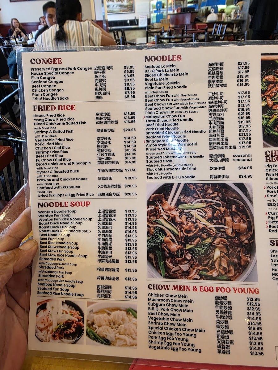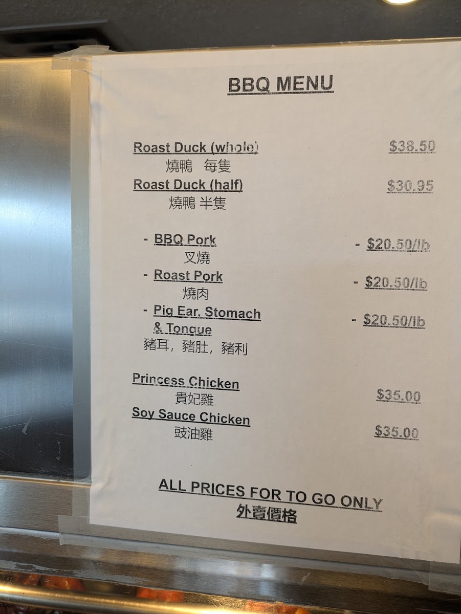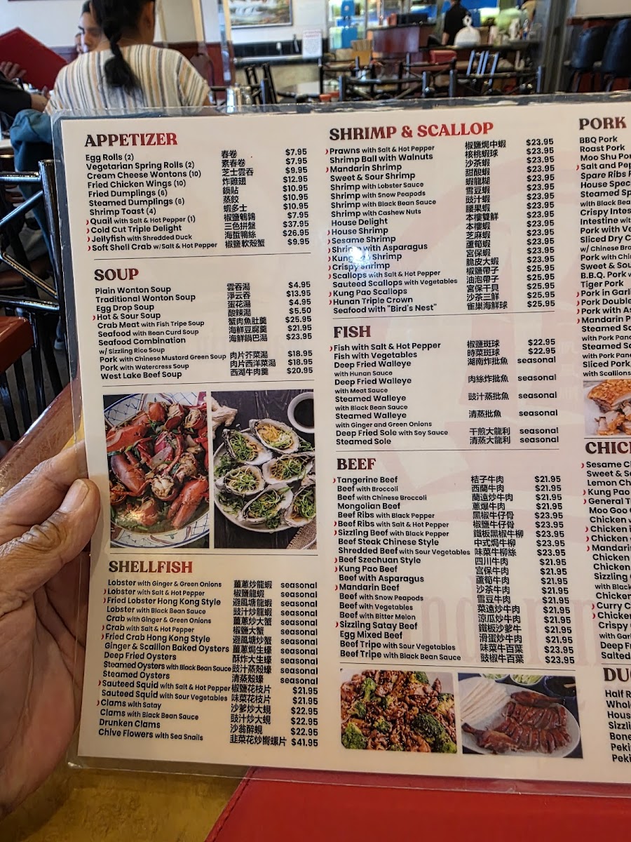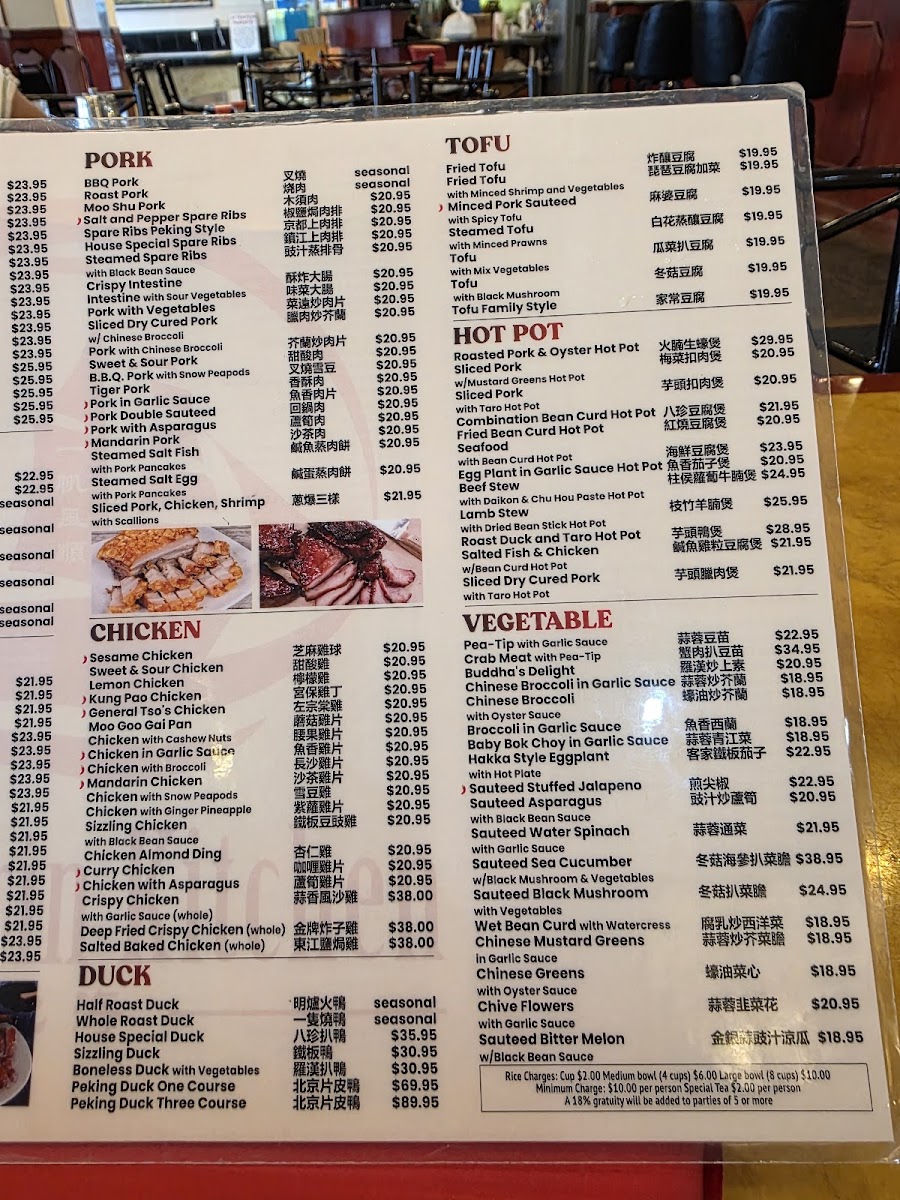 Sliced Boneless Duck topped with BBQ Pork, sliced white meat chicken, shrimp and lettuce in a dark brown gravy.